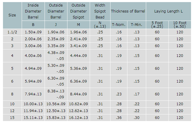 វិមាត្រ និងភាពអត់ធ្មត់ (គិតជាអុិនឈ៍) នៃព្រុយ និងធុងសម្រាប់បំពង់ និងឧបករណ៍ភ្ជាប់គ្មានស្នូល។